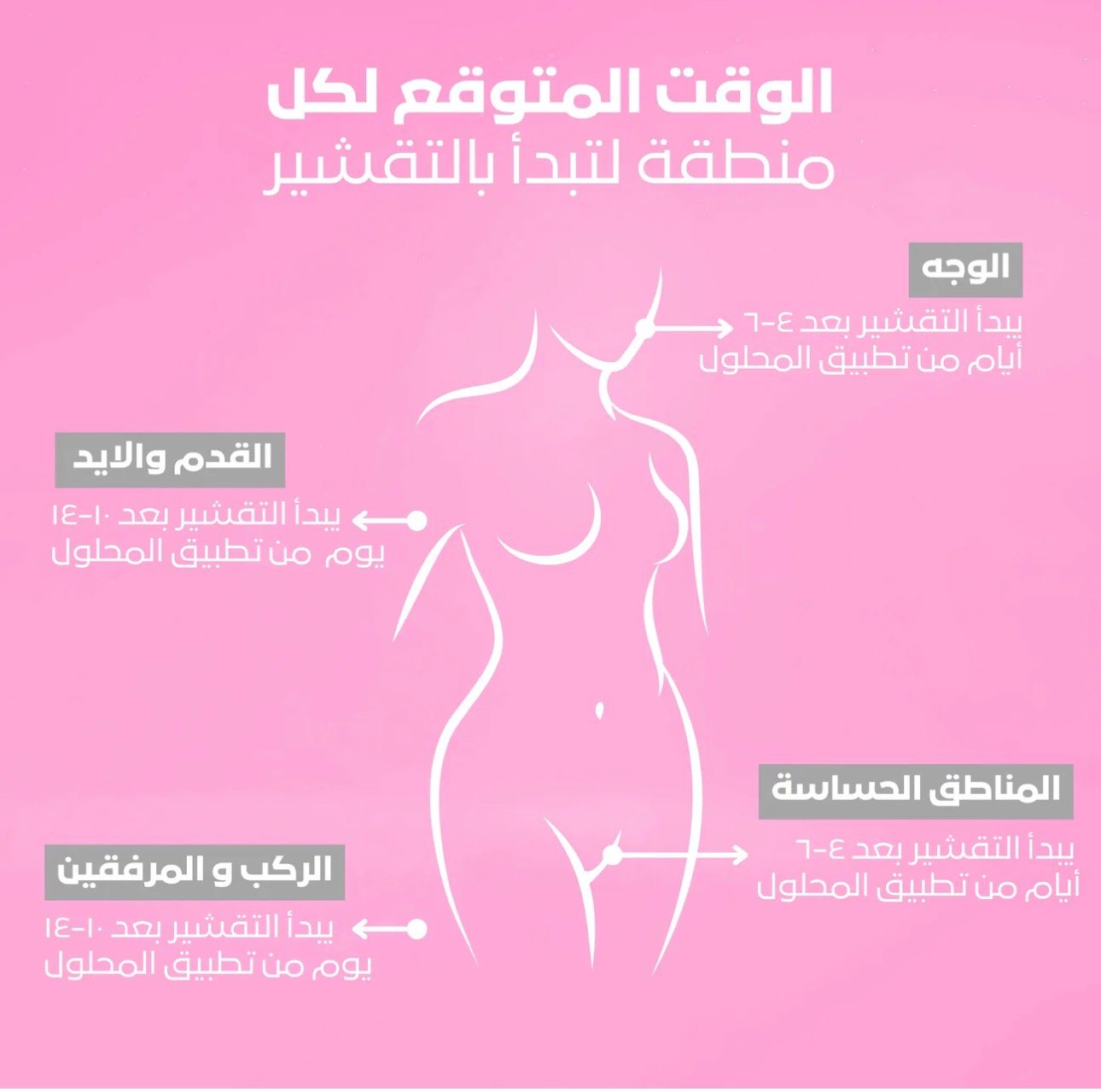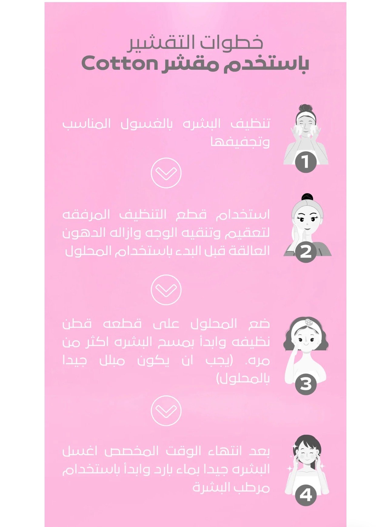 3-ﺿﻊ اﻟﻤﺤﻠﻮل ﻋﻠﻰ ﻗﻄﻌﮫ ﻗﻄﻦ ﻧﻈﯿﻔﺔ ) ﺗﺎﻛﺪ ان ﺗﻜﻮن اﻟﻘﻄﻨﺔ ﻣﺒﺘﻠﮫ ﻛﻠﯿﺎ ﺑﺎﻟﻤﺤﻠﻮل ( وأﺑﺪأ ﻓﻲ وﺿﻊ اﻟﻤﺤﻠﻮل ﻋﻠﻰ اﻟﺒﺸﺮة اﻟﻤﺮاد ﺗﻘﺸﯿﺮھﺎ ﺑﻌﺪه طﺒﻘﺎت وﻟﻌﺪة دﻗﺎﺋﻖ ﺣﺴﺐ اﻟﻤﻨﻄﻘﮫ اﻟﻤﺮاد ﺗﻘﺸﯿﺮھﺎ